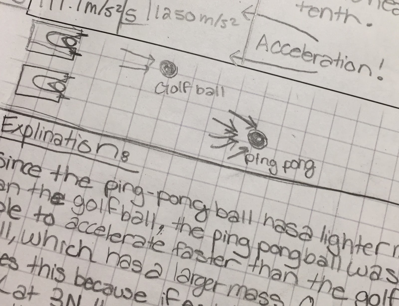 During this forces activity, students were given ping pong balls, golf balls, spring scales, rubber bands of different sizes, meter sticks and a thick cardboard piece with a u-shaped cutout and nails (see photo). As a springboard for learning about Newton’s 2nd Law, they were asked to create a model that proved that force, mass and acceleration are related.